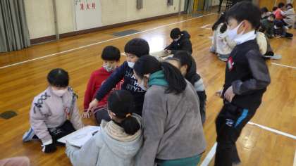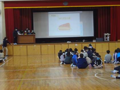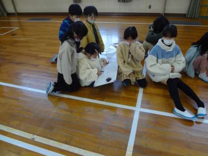 5年生が企画・司会・進行を行いました。ボードにお題の絵をかいて、何の絵かあてるゲームの様子です。縦割り班ごとに楽しく取り組んでいました。