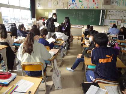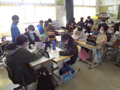 学級活動で、5年生での生活を振り返っています。体育の授業、台上前転にチャレンジしています。図工の授業、作品の下絵を考えています。