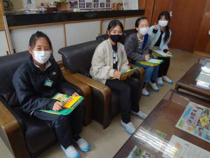 総合の授業、グループで話し合いをしています。校長室にも6年生の児童が取材に来ました。
