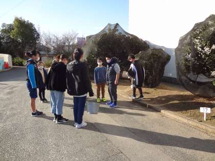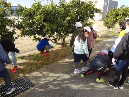 ペア学年でミカンの木にお礼肥をあげました。今年の実りをねぎらい、感謝の気持ちを込めてていねいに肥料をあげました。