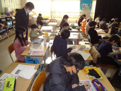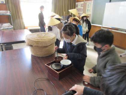 市の文化財課の方を講師にお招きし、むかしの道具の学習をしました。持って来ていただいたむかしの道具を実際に触れ、最後に学んだことをまとめました。