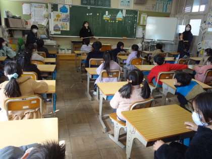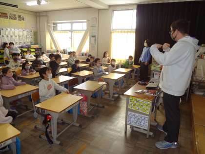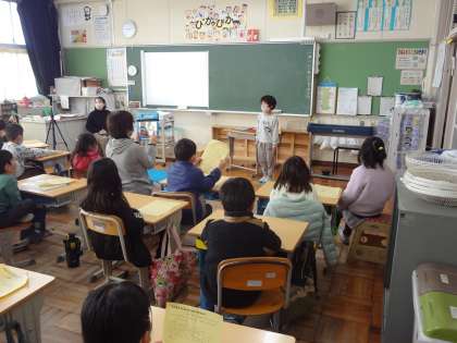 生活科で学習発表会を行い、記録もしています。道徳の授業、前に出て意見を発表しています。外国語活動で、ALTの先生と楽しく学習しています。