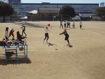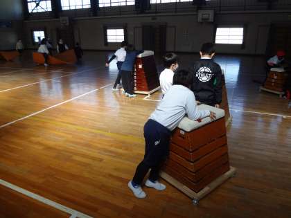 体育の授業、運動場でグループに分かれて元気よくボール運動をしています。体育の授業、跳び箱とマットを、全員で協力して準備しています。