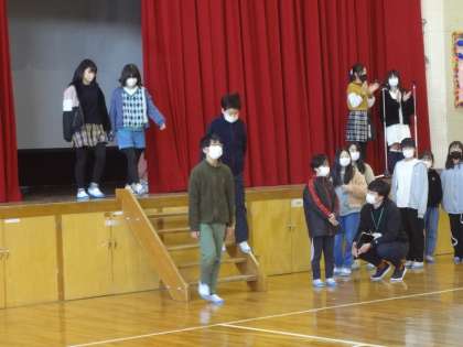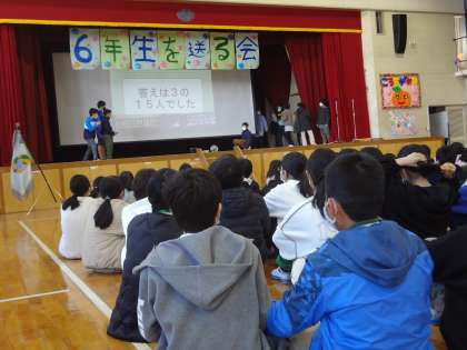 6年生の入場。拍手でお迎えします。5年生が司会進行しました。6年間を振り返るクイズです。