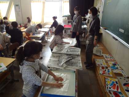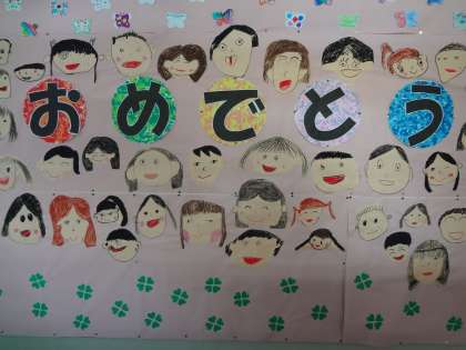 1年生が作成した、おめでとうメッセージです。図工の授業で、版画の印刷をしています。