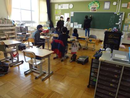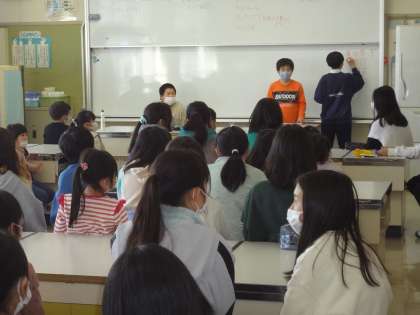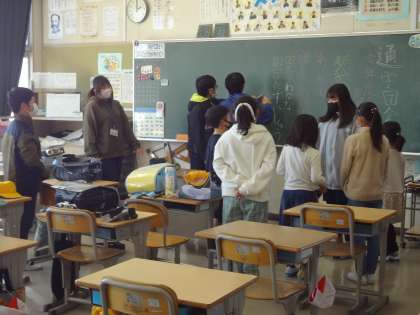 通学団会を行い、1年を振り返りました。新年度にむけて、新しい団長さんなどを決め、2列での並び方も新たに決めました。
