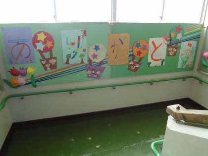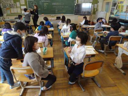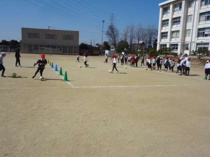 2年生のありがとうのメッセージです。算数の授業、紙テープを折りまげて、いくつに分けたかを見せ合っています。体育の授業、サッカーのドリブルを練習しています。