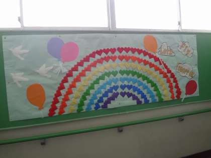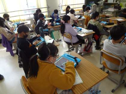 お祝いメッセージの掲示です。社会科で、タブレットで市町村を調べています。