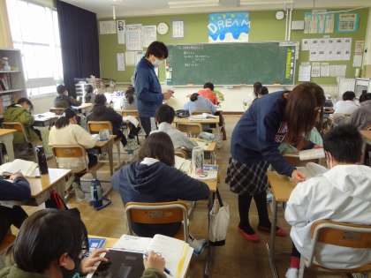 算数の授業、5年生の復習に取り組んでいます。国語の学習で、手塚治虫の教材を学習しています。