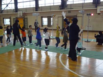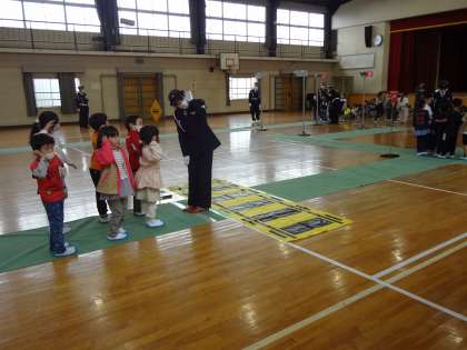 交通安全協会の皆様に指導していただきました。体育館に信号や踏切を設置して、横断の練習をしました。