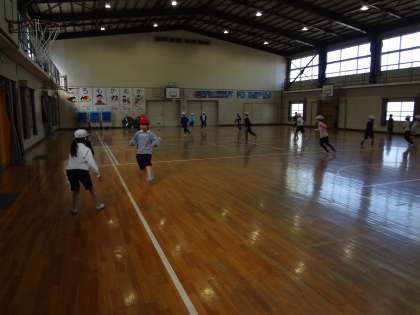 体育の授業、体育館を元気に走り回っています。算数の授業、学習用タブレットを使用しています。理科の授業、タブレットで撮影した植物を黒板にはって、見合っています。