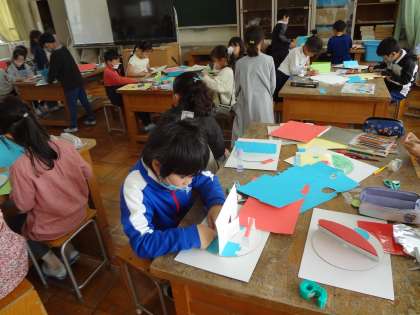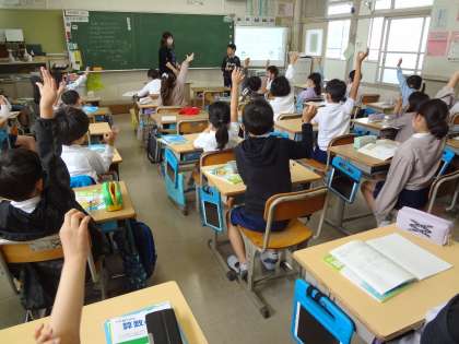 国語の授業、昆虫の身の隠し方を読み取る学習をしています。図工の授業で、回る仕掛けを使っての工作をしています。算数の授業、友達の意見にハンドサインで反応しています。
