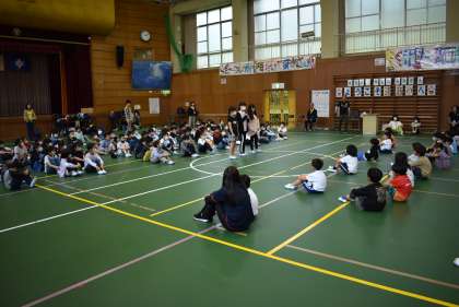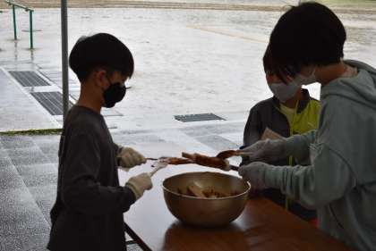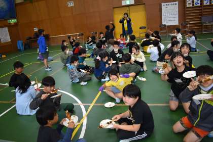 焼いた五平餅にたれをぬっています。五平餅をおいしくいただきました。終わりの会で代表児童が道慈小学校の皆さんにお礼を言いました。