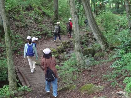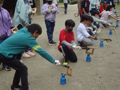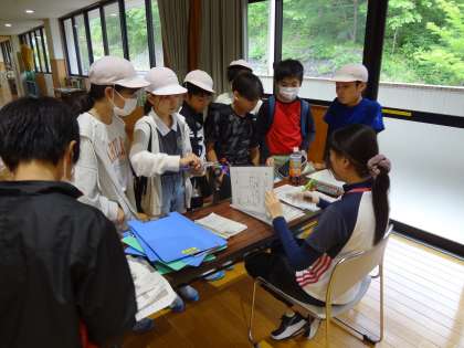 オリエンテーリング、ポストを探して山の中を歩きます。オリエンテーリング、ゴールで先生のチェックを受けます。クラフトで写真入れを作ります。木の枠をガスバーナーでこがしています。