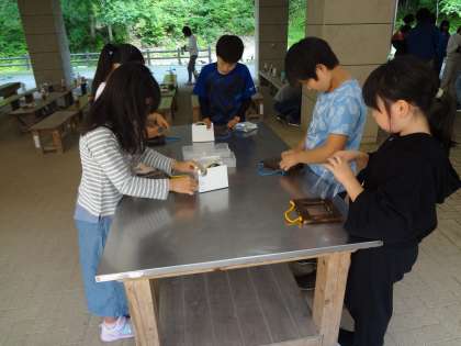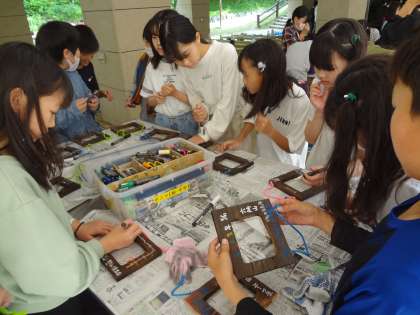 クラフトで写真入れ作り。こがした木の枠をたわしや雑巾で磨きます。木の枠にひもやビニールをつけます。ペンで模様や文字を書いています。