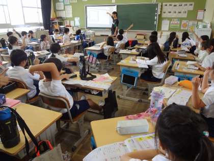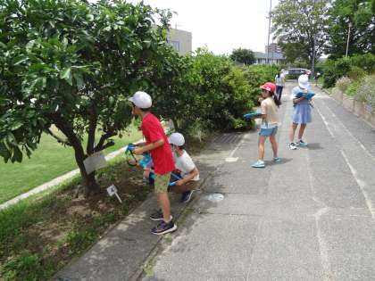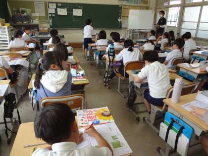 国語で漢字の書き順を学習しています。理科で、昆虫の体のつくりについて話し合っています。みのり学習で、学習用タブレットを使って、みかんの観察をしています。小さな緑色の身ができています。