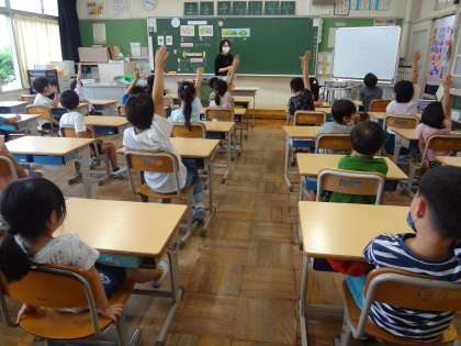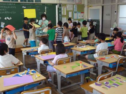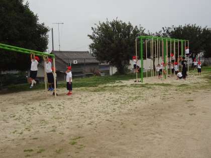 算数の授業、良い姿勢でピンと手を挙げていました。図工の授業、破いた紙から発想して作品を作ります。体育の授業、雲梯やのぼり棒にチャレンジしていました。