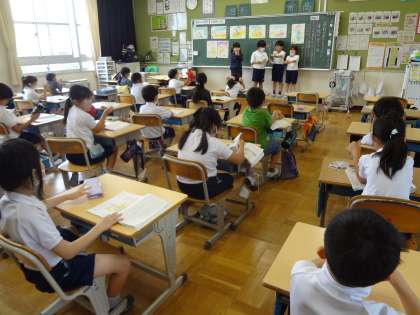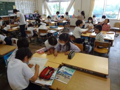 グループになって目標を考えています。図工に楽しく取り組んでいます。国語の音読を発表していました。
