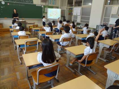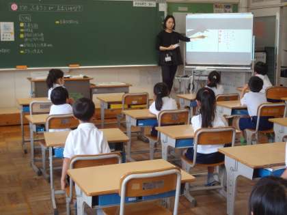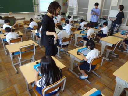 かずしらべの学習です。スクリーンを見て気づいたことを発表しています。学習用タブレットを操作して、果物の数を整理して数えています。2人のこの考え方を比べて果物の数え方を考えます。