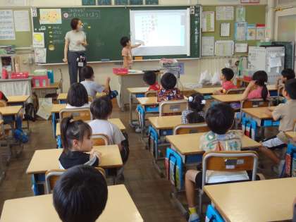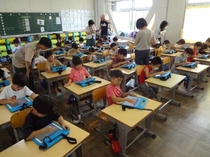 かずしらべの学習です。学習用タブレットを使って、果物を数えやすいように並べています。スクリーンに映した自分の意見を友達に説明しています。