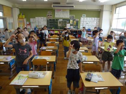 あいうえおの合言葉「明るいあいさつ 友達の輪」の手話にチャレンジしています。写真は「明るい」をあらわす手話です。