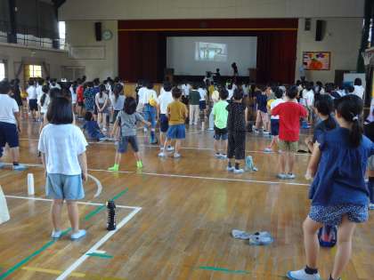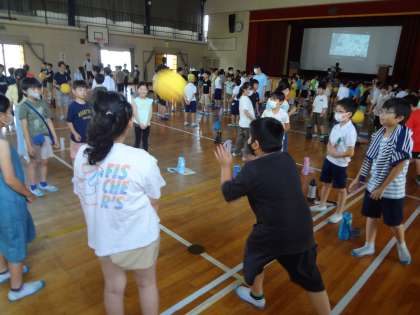 4年生が企画・司会・進行をつとめました。作成した動画でゲームの方法を説明します。縦割り班ごとにボールを使った楽しいゲームをしました。