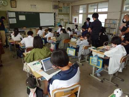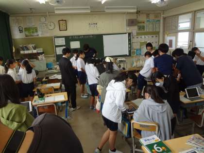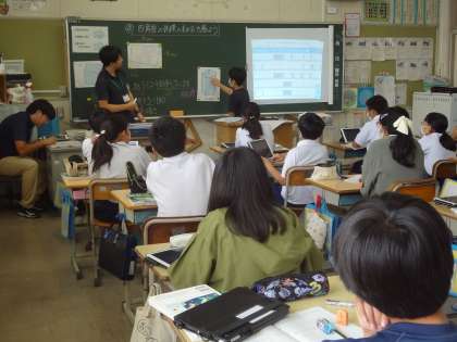 算数の授業、タブレットで底面積について考えています。席を離れて友達と意見交換しています。前に出て意見を発表しています。