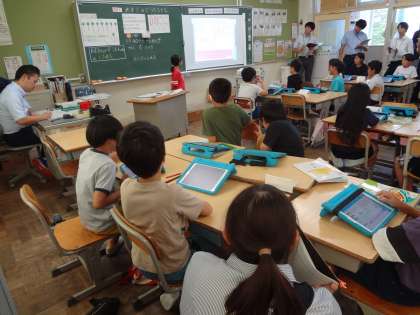 ゲームのような復習問題で楽しく授業をスタート。グループの友達と意見交換しています。クラスの全員での話し合い、スクリーンに自分の意見を映して説明しています。
