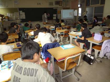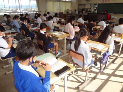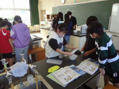 算数の授業、課題提示の場面です。音楽の授業、リコーダーの練習をしています。理科の授業、理科室でグループごとに実験をしています。