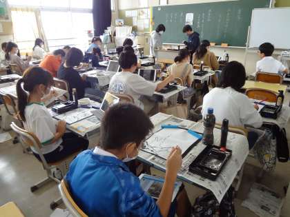 修学旅行のまとめをグループごとにタブレットで作成しています。書写の授業、水墨画に挑戦しています。修学旅行のまとめの発表練習をしています。