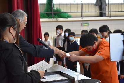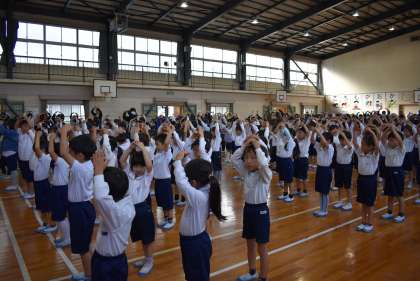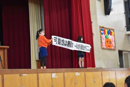 全校集会を行いました。後期の学級代表と正副委員長の認証を行いました。あいうえおの合言葉を言ったり、校歌を歌ったりしました。最後に運動会のテーマ「可能性は無限大〜みなぎる勇気を今ここに〜」の発表がありました。
