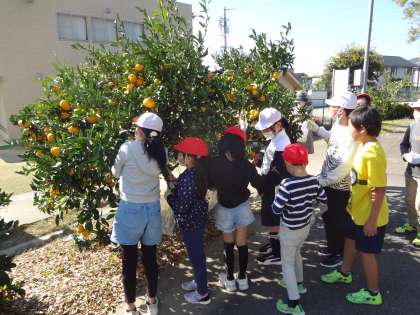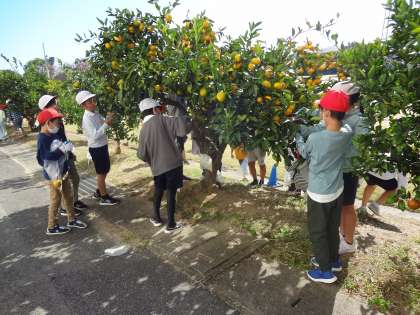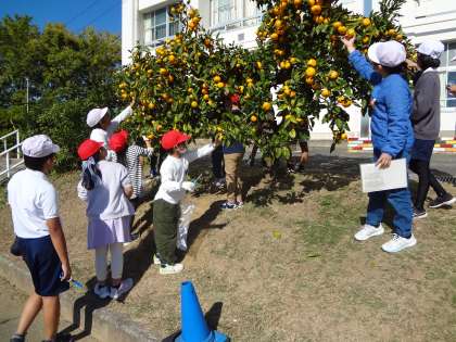 2年生と5年生がミカンの収穫を行いました。