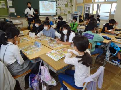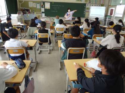 外国語活動で、グループ学習をしています。算数の面積の学習で、単位の関係について考えています。理科の授業、月の動きや満ち欠けについての学習をしています。