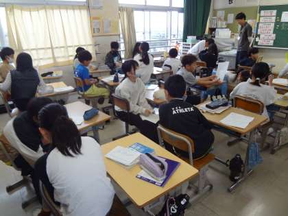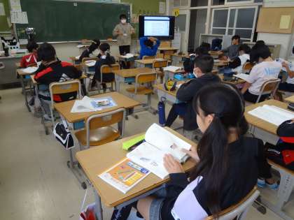 道徳の学習、お話を聞いています。算数の学習、隣同士で意見を交換しています。