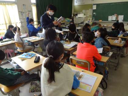 理科で流れる水の働きを学習しています。社会でグループ学習をしています。