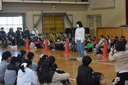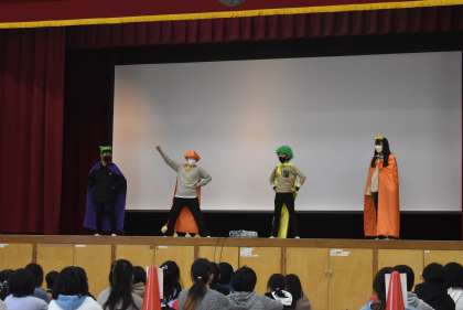 出会いの会です。ミカンマンも登場しました。2年生の交流の様子です。