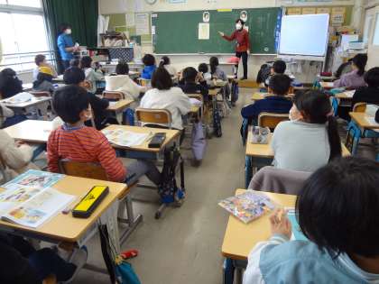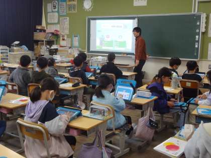 算数の復習、タブレットを使って問題を解いています。道徳の学習、家族をテーマにしたお話です。音楽の授業、教科書の歌を聞いていました。