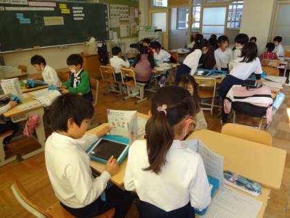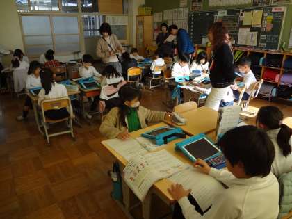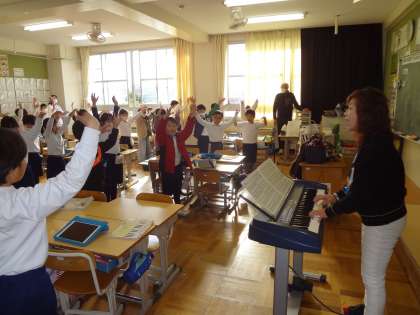 2年生の音楽の授業研究会です。ドレミの歌に合わせてリズム運動をしています。グループで2拍子のリズムを打楽器で演奏する練習をしています。今日の学習で学んだことを書いています。