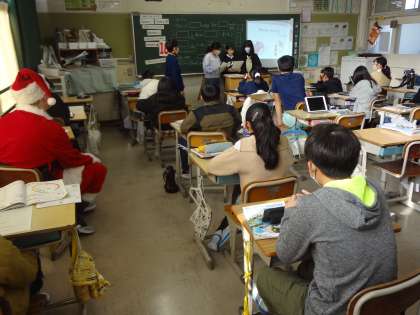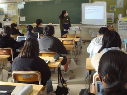 外国語の授業、みんなの前でスピーチをしています。社会科の授業、プレゼン形式で意見を発表しています。理科の授業、資料を使って調べ学習をしています。