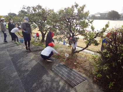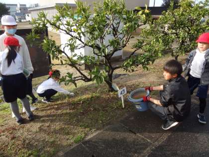 1年と6年のペア学年で、みかんの木にお礼肥をあげました。