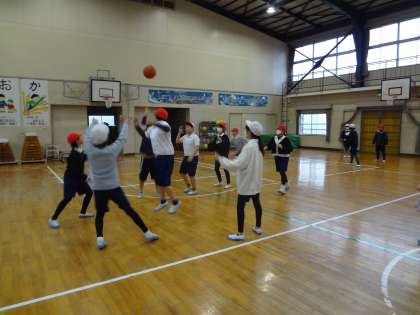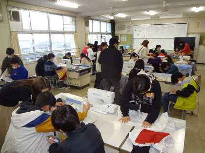 家庭科でミシンを使っています。ミシンボランティアさんにも支援していただいています。体育の授業、バスケットボールをしています。行事の準備をしています。