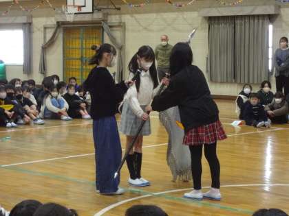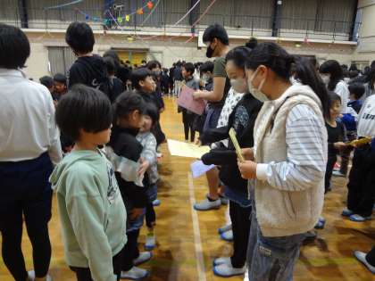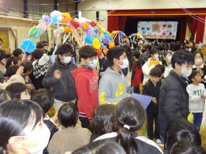 1年生が6年生にプレゼントを渡しました。6年生から5年生に校旗を渡しました。花のアーチをくぐって6年生が退場しました。