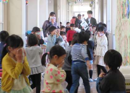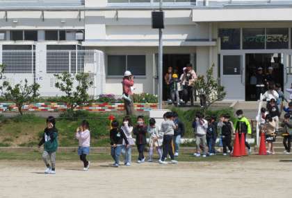 緊急放送を落ち着いて聞いた後、どこで火事が起きたのか、どのように避難すればいいのかを考え、担任の先生の指示のもと、全校児童が避難経路を確認しました。