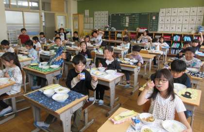 2年生の教室をのぞくと、おいしそうに給食を食べていました。