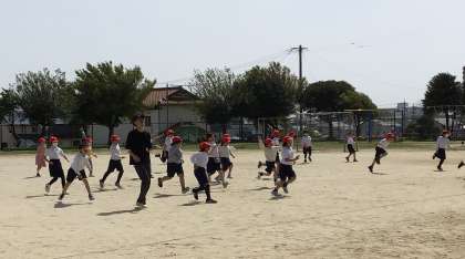 先生が「まえ」と言うと、子供たちは「うしろ」と言いながら身体を動かします。