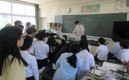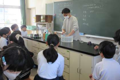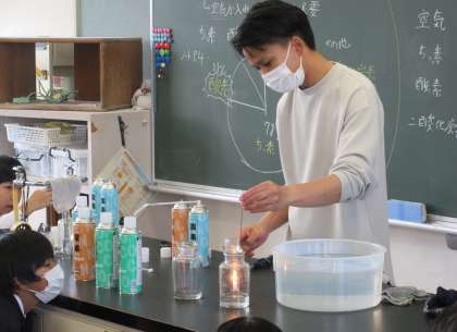 担任の先生が代表で実験を行い、6年生は自分の予想とあっているのか興味をもって観察していました。