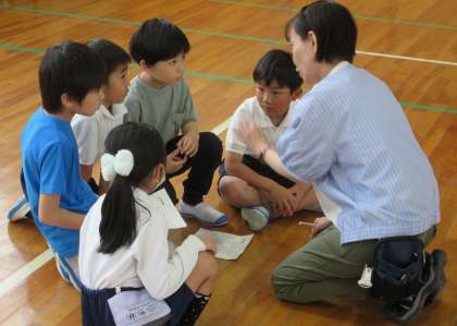 学校探検は、2年生と1年生がグループになって、リーダーの2年生が学校の中を案内します。