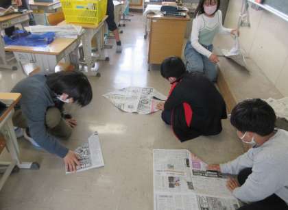 体育委員会は、投げる力を向上させるアイテムとして、新聞で紙でっぽうを作り、紹介する準備をしました。