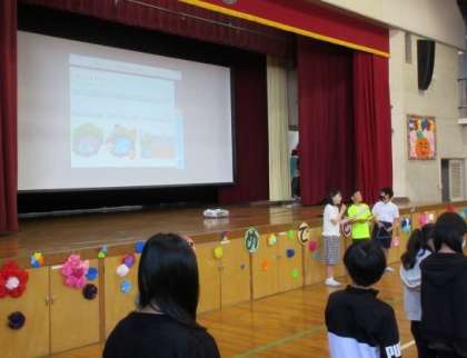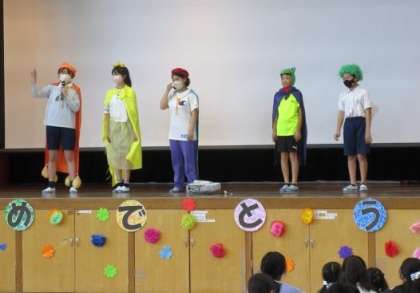 3時間目に体育館で1年生を迎える会を行いました。