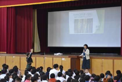 たけのこや竹の秘密とともに、竹のように、節目を大切にしたり、友達と力を合わせたりして、「しなやかな強さ」を身に付けてぐんぐん伸びて行ってほしいと話しました。